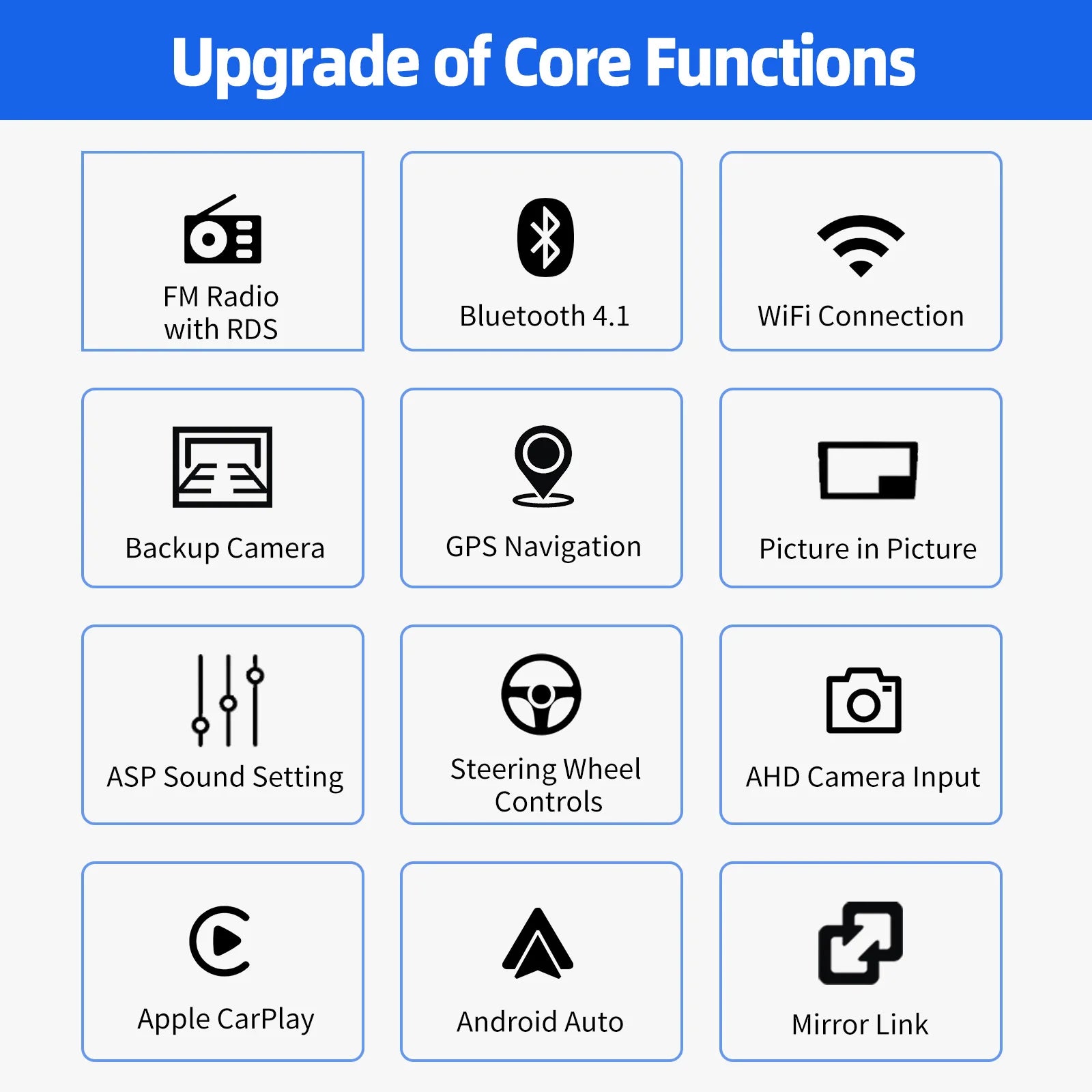 - Sound and media: 4×45W amp, 32‑band EQ, RDS FM radio with 18 presets; enjoy Android Auto, Apple CarPlay, Mirror Link, and USB/SD playback.