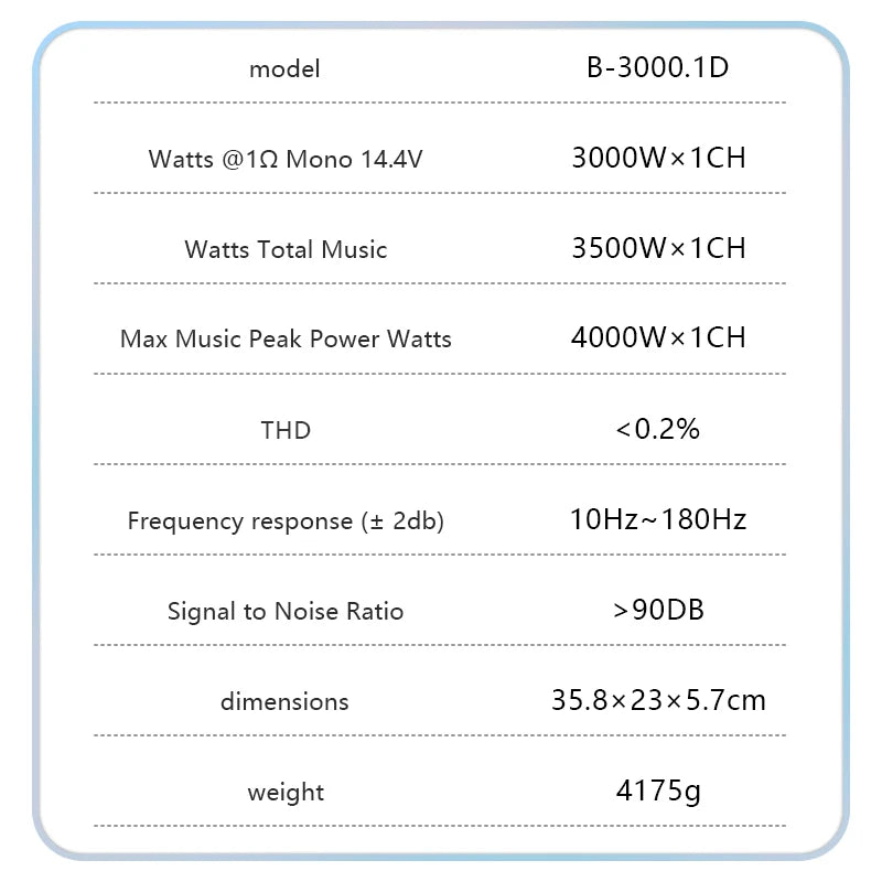 - Powerful mono Class D output up to 3000W, delivering thunderous bass and precise transients with minimal heat; built-in protection guards against short circuits and thermal overload.