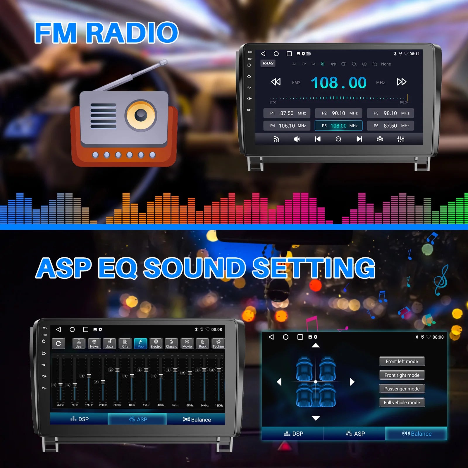 - Android 13 performance on a 1280×720 HD IPS display with 2+32GB, 2+64GB, or 4+64GB options, 4x45W audio, RDS/FM, Bluetooth 4.1, Mirror Link, and reversing camera input.