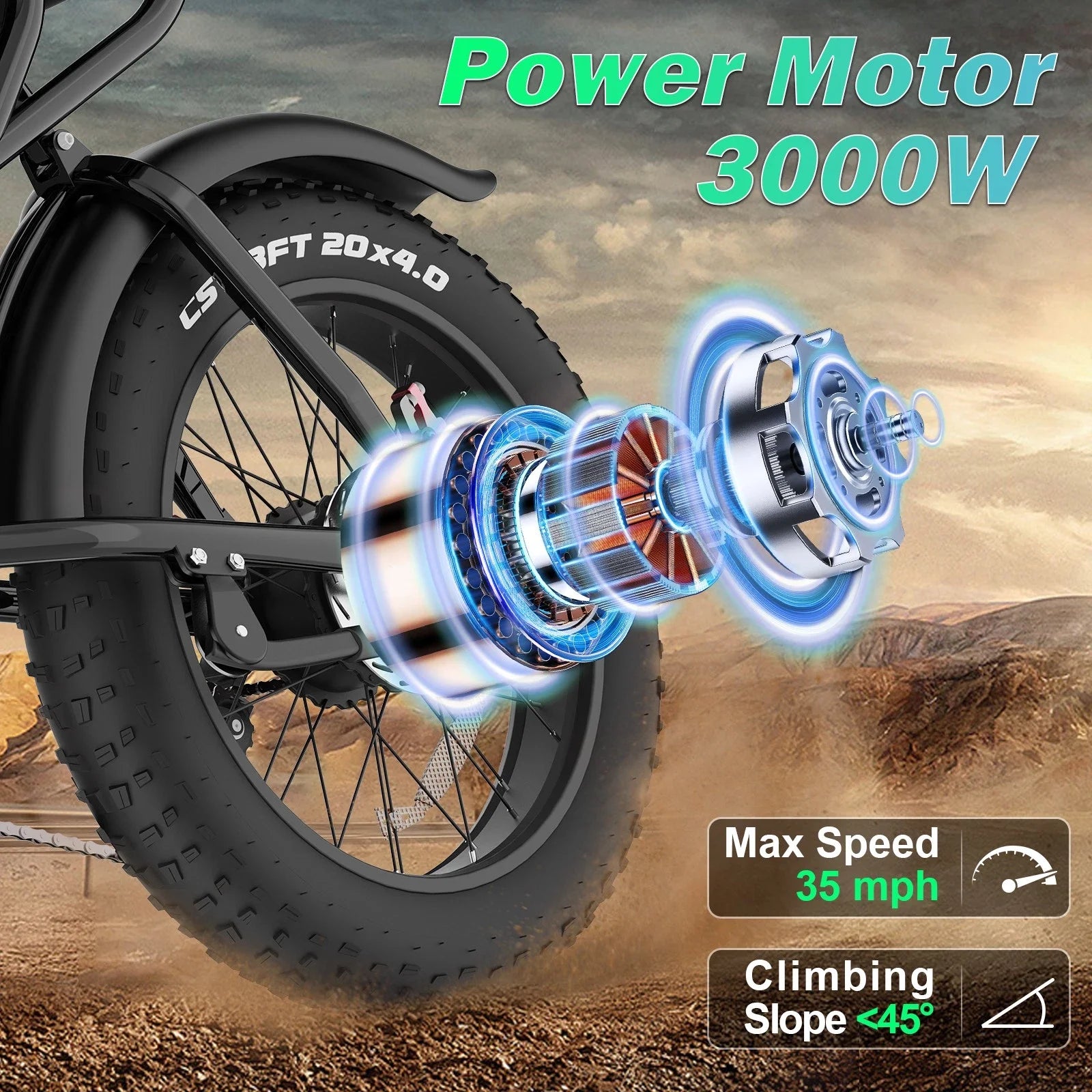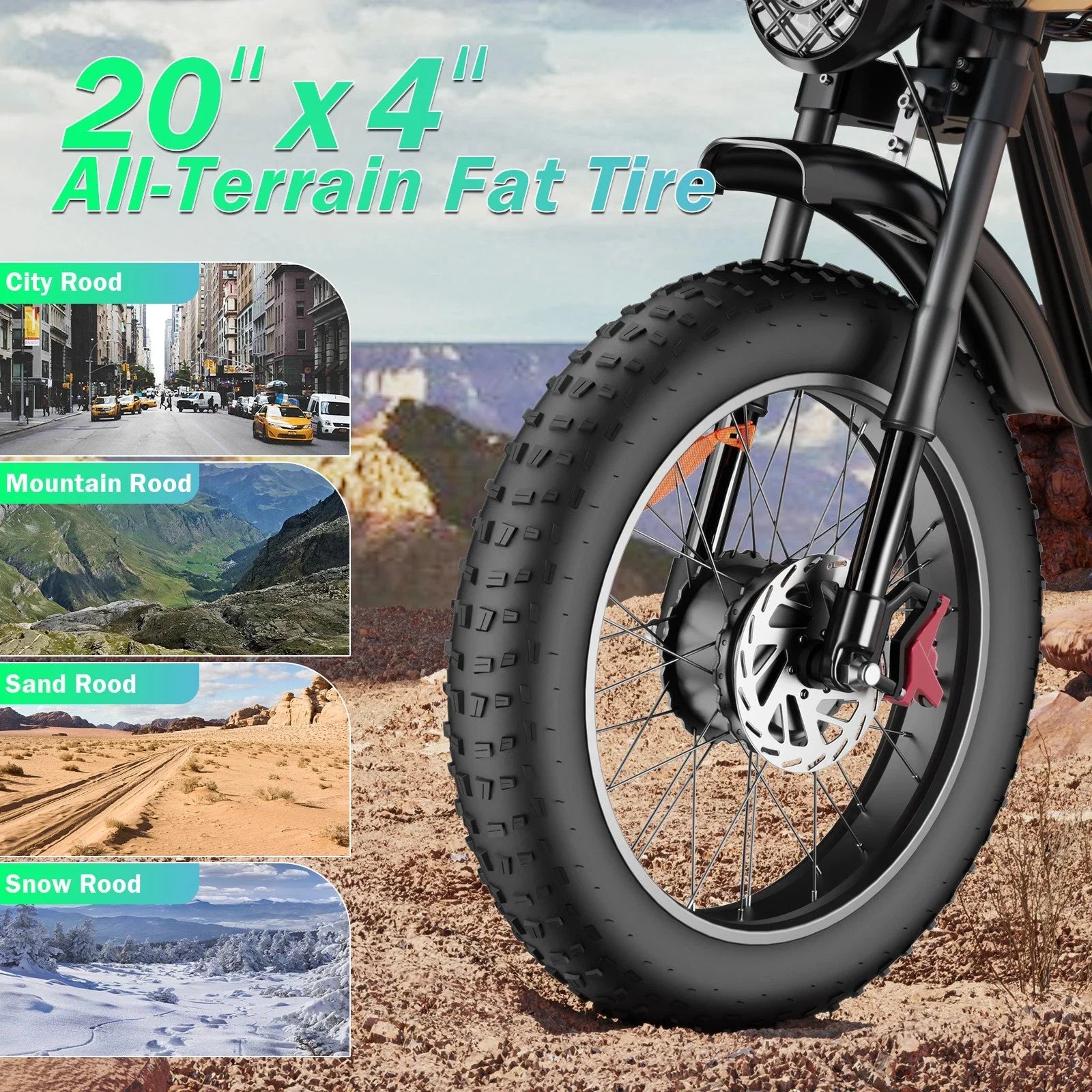 - Tackle rough roads with 20" x 4.0" fat tires, front suspension and rear shock, plus hydraulic dual brakes and a bright LED headlight for safer night rides.